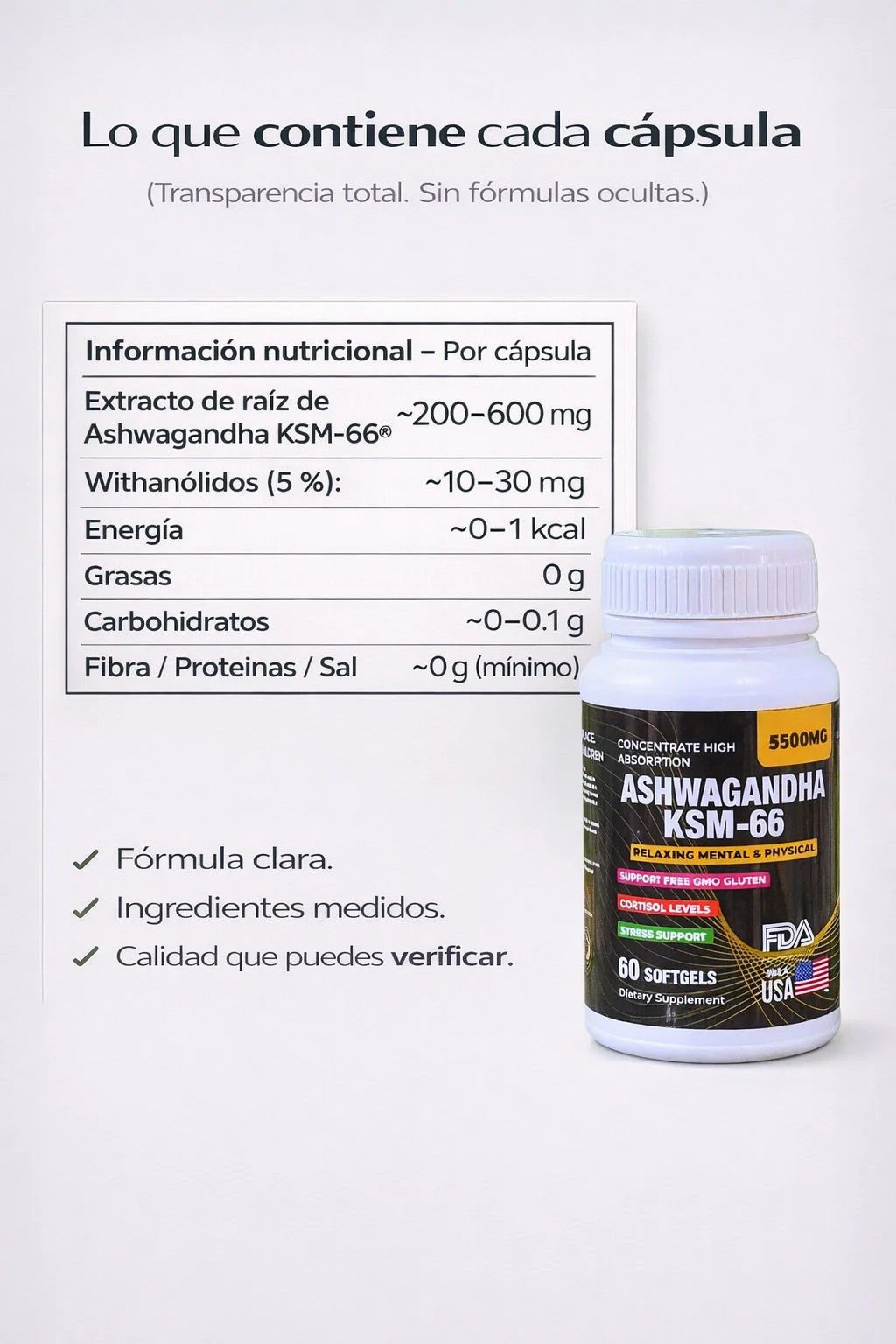 La Ashwagandha tradicional es como una lotería: nunca sabes cuántos componentes activos estás recibiendo. Nuestro extracto está estandarizado al 5% de withanólidos, asegurando que cada cápsula tenga la potencia exacta necesaria para regular tu sistema nervioso.